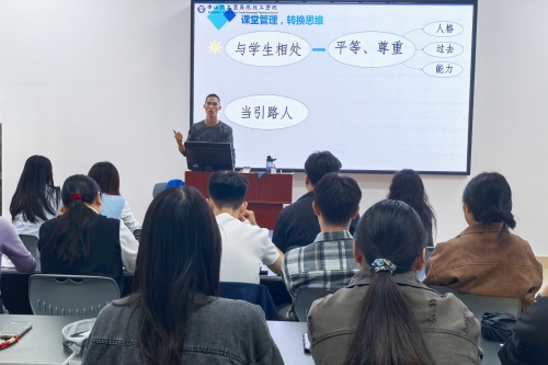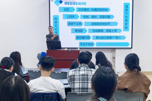 培训中,罗家文主任从“思维转换”“管理策略”等等方面详细讲述了课堂管理要点和原则,并调课堂管理不仅是管纪律,更是“管人、管思想、管习惯”的育人过程,过程中还分享一系列课堂管理小技巧,轻松幽默中见智慧,引得在场教师频频点头并积极互动。