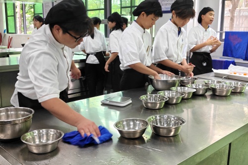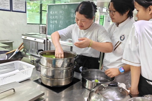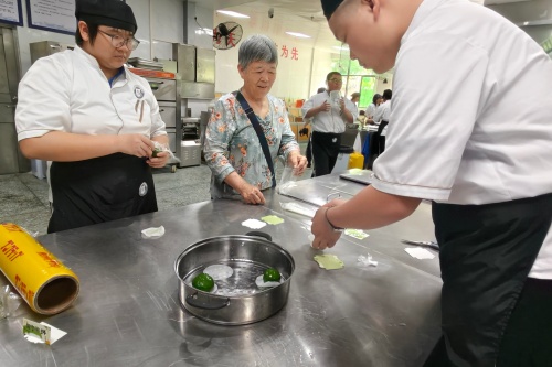 在厉娟娟老师的带领下,家长们和孩子并肩站在操作台前,从揉面、调馅到包制、蒸制,沉浸式体验中西面点专业的日常课堂。她从青团的文化渊源讲起,拆解艾草处理、粉类配比、火候把控等每一个专业细节,让家长们亲眼见证孩子在学校学到的,不只是一门手艺,更是中式饮食文化里的匠心与传承。